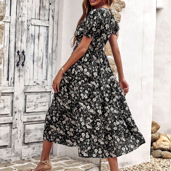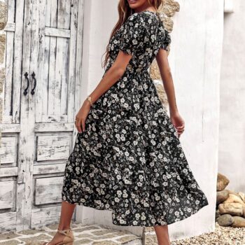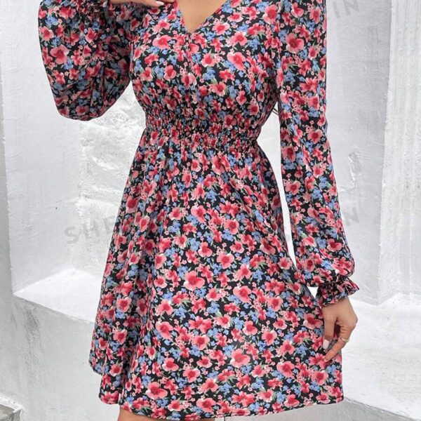 women's floral dress Allover Floral Print Puff Sleeve Ruffle Hem Dress