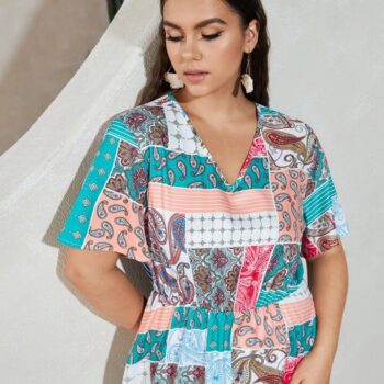 Introducing our "Plus Paisley And Patchwork Print Asymmetrical Hem Dress", a stunning ensemble crafted to elevate your style quotient. Embrace the fusion of paisley motifs and intricate patchwork designs, seamlessly integrated to create a unique visual appeal.