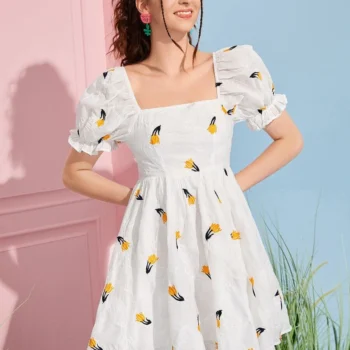 Vestidos Bordado floral Gola Quadrada Manga Bufante" is a captivating piece in women's fashion. This dress boasts intricate floral embroidery, adding a touch of delicate charm to its design. The square neckline lends a modern edge, while the voluminous puff sleeves exude a sense of playful elegance. Perfect for special occasions or adding flair to everyday wear, this dress effortlessly combines femininity with contemporary style.