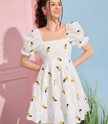 "Floral Print A-line Dress with Tie-Up" is a delightful blend of elegance and charm, designed to elevate your feminine grace. Crafted with a flattering A-line silhouette, this dress showcases a vibrant floral print that exudes freshness and vitality.