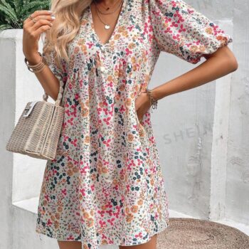 Introducing the VCAY Allover Floral Print Puff Sleeve Dress, a radiant blend of feminine elegance and contemporary flair. Crafted with meticulous attention to detail, this dress boasts a captivating floral print that adorns its entirety, infusing every inch with vibrant charm.