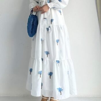 This dress features a delightful all-over print that adds a pop of color and personality to the ensemble. With puff sleeves and a ruffle hem detail, it exudes a sense of playful elegance, while the smock silhouette offers a comfortable and flattering fit for all body types.